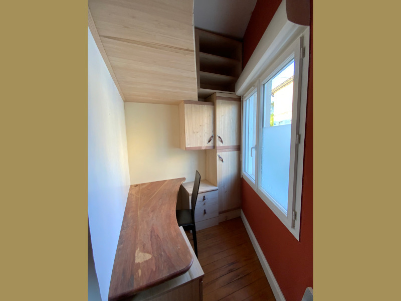 Plateau bureau en pommier massif, rangement en châtaignier et pommier, poignées cuir.