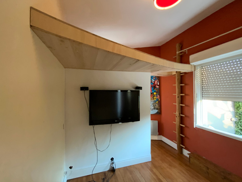 Mezzanine aérienne en forme de delta, châtaignier de pays massif, échelle fruitière traversante en châtaignier.